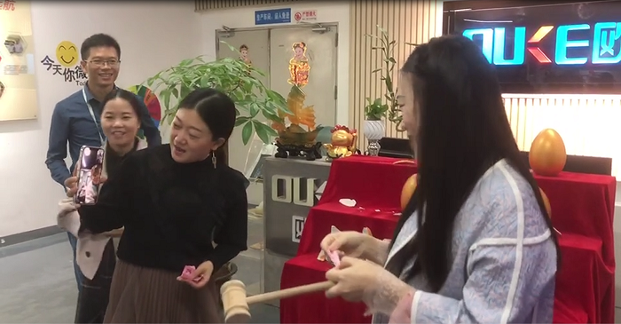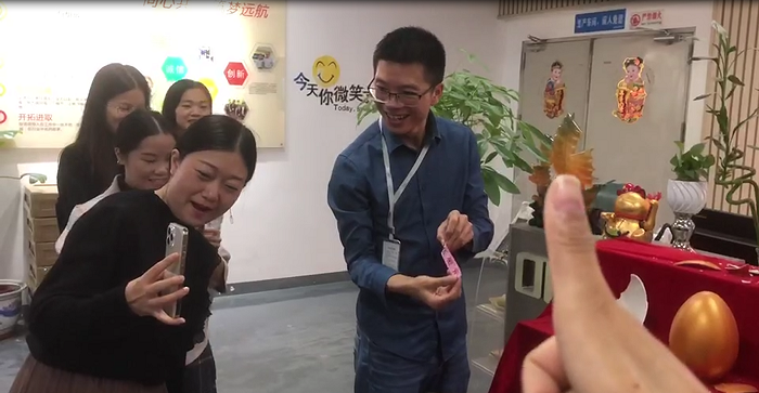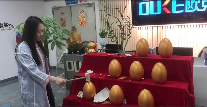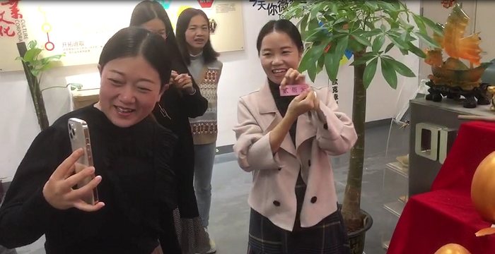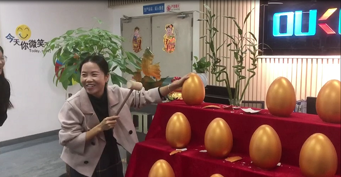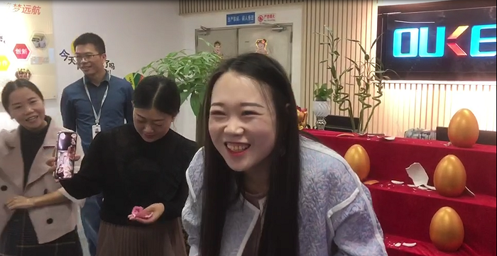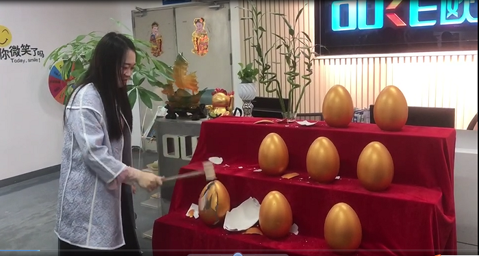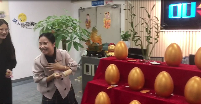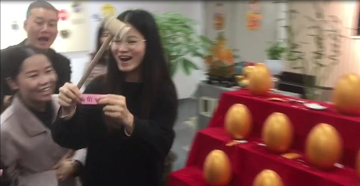 今天砸金蛋的第一位是公司的銷冠,因?yàn)殇N冠有事在武漢出差,有美麗大方的設(shè)計(jì)小姐姐代勞,設(shè)計(jì)小姐姐沒有讓我們的銷冠失望,一砸砸出來個(gè)500元現(xiàn)金大獎(jiǎng),這是一個(gè)大驚喜。
